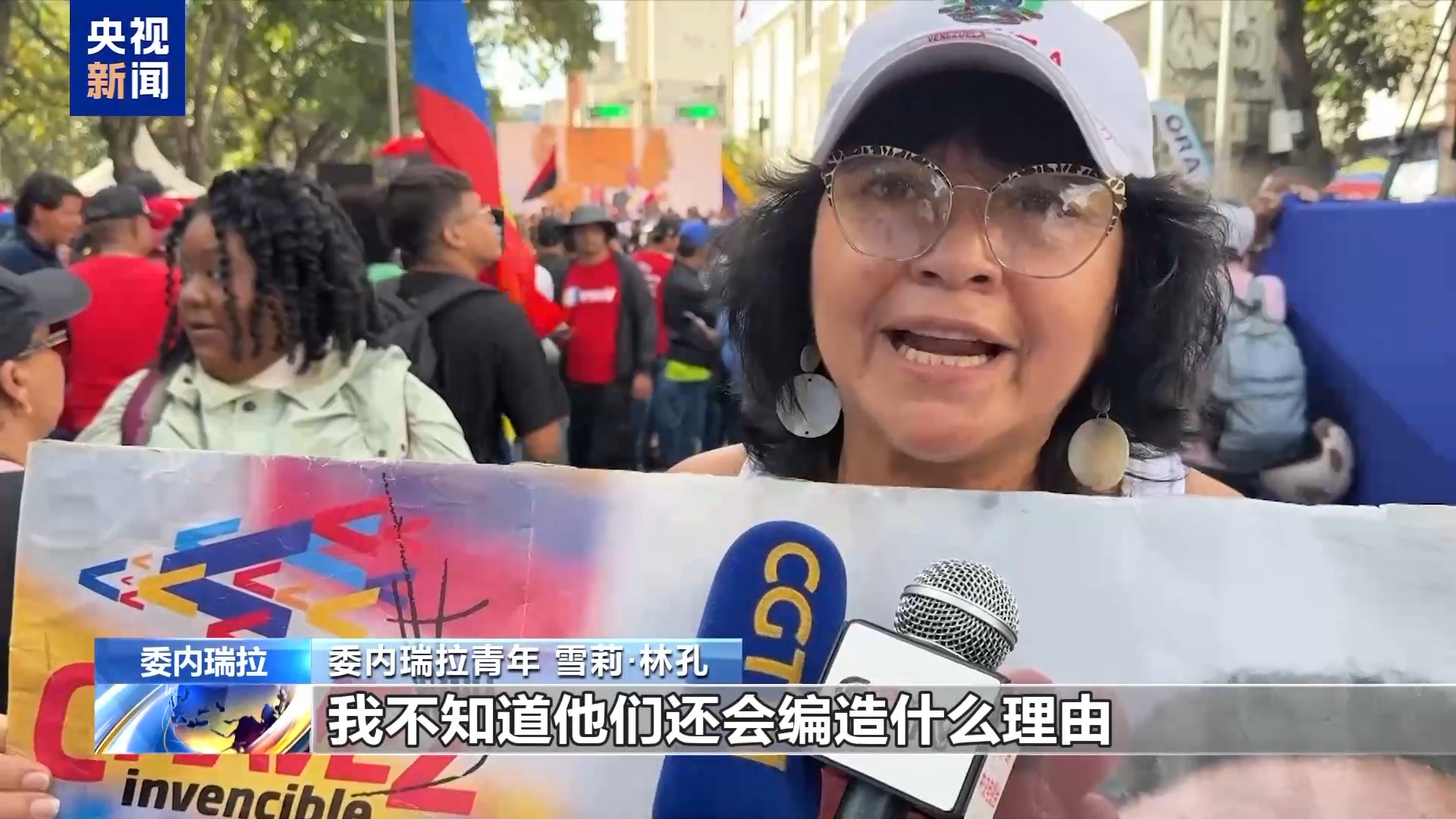 委内瑞拉青年 雪莉·林孔:我不知道他们还会编造什么理由把总统夫妇扣留在那里。但我们从这里向我们的总统夫妇送去力量与坚定。